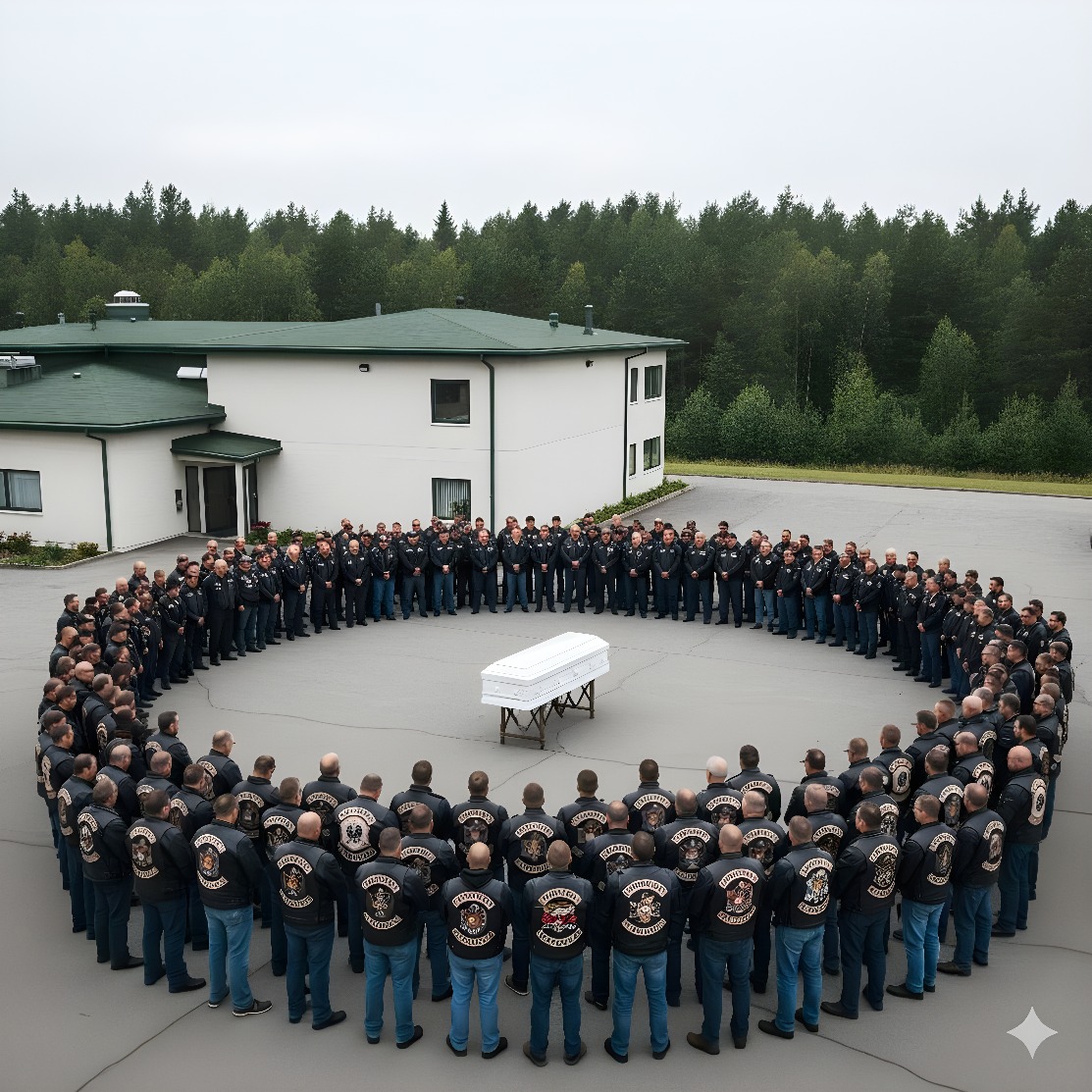 By mid-afternoon, the chapel parking lot and surrounding streets vibrated with the thunderous roar of over three hundred motorcycles. Men and women wearing leather jackets and club patches removed their helmets, standing solemnly.