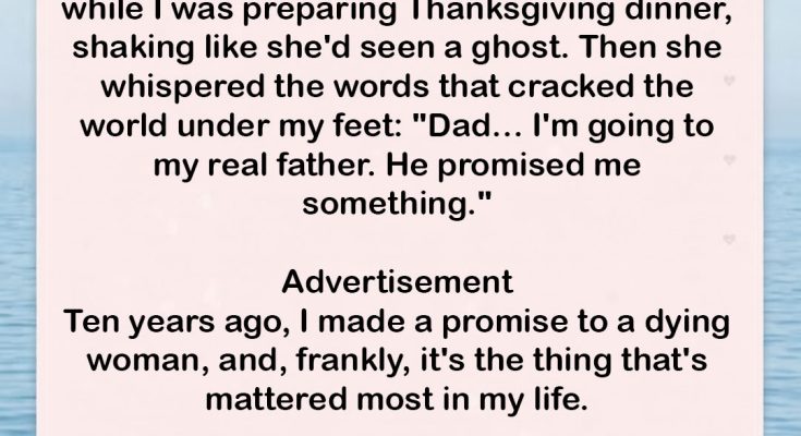 Ten years after I adopted my late girlfriend’s daughter, she stopped me while I was preparing Thanksgiving dinner, shaking like she’d seen a ghost. Then she whispered the words that cracked the world under my feet: “Dad… I’m going to my real father. He promised me something.”