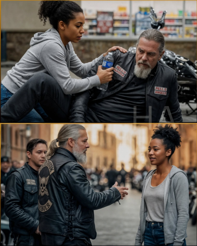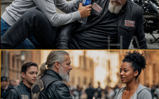 That’s when she saw him clearly: a biker, towering and heavily built, tattooed arms visible under the station’s harsh lights. The patch on his vest read HELL’S ANGELS. He leaned against his bike for a second—then his knees seemed to give out, and he collapsed.